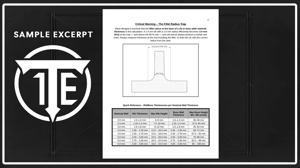 Battle-tested plastic part design rules from 10+ years designing for high-volume programs at a U.S. Tier-1 automotive supplier (Toyota, GM, Ford & more). 59 pages of practical tables and ratios for walls, ribs, snaps, tolerances, and more — the KISS approach that eliminates rework and delivers first-shot approval. No theory overload — just what works in real parts, and why. - $199 PDF - Lifetime updates. Instant download.